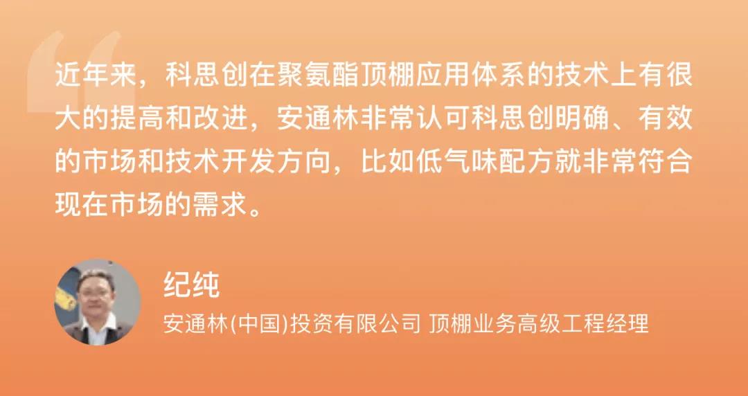 ????????在合作過(guò)程中,安通林以主動(dòng)開(kāi)放的合作方式,為科思創(chuàng)提供有效的試制環(huán)境,并在研發(fā)過(guò)程中針對(duì)產(chǎn)品特性及時(shí)提出改進(jìn)建議,最終取得了可喜的成果??扑紕?chuàng)研發(fā)的聚氨酯頂棚解決方案采用了新型ISO生產(chǎn)工藝和新一代聚醚體系,可減少預(yù)攪拌流程。該材料穩(wěn)定性高,避免了頂棚不同區(qū)域吸音性能波動(dòng)大的問(wèn)題。同時(shí),針對(duì)不同車(chē)型的技術(shù)要求變化,科思創(chuàng)可提供較寬的技術(shù)指標(biāo)范圍,能夠以一組體系滿(mǎn)足傳統(tǒng)兩組體系才能達(dá)到的效果。此外,使用該解決方案,VOC排放較行業(yè)主流水平可降低至多30-40%,有效提升了一個(gè)級(jí)別。