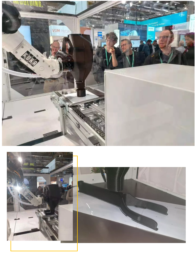 ????????據(jù)悉,伊之密SpaceA機器人柔性增材制造系統(tǒng)制品可適用于汽車、家電、建筑等領(lǐng)域,提供經(jīng)濟高效的生產(chǎn)方法并實現(xiàn)非常規(guī)組件的高質(zhì)量自動化生產(chǎn)。而通過將原料擠出的形式,SpaceA可以直接使用含纖維填充的熱塑性顆粒料進(jìn)行生產(chǎn)。