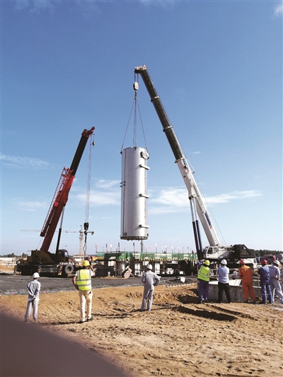 ????????11月2日,中國(guó)化學(xué)工程第六建設(shè)有限公司承建的海南華盛26萬(wàn)噸/年非光氣法聚碳酸酯(PC)項(xiàng)目3臺(tái)導(dǎo)熱油爐主體吊裝一次性就位。