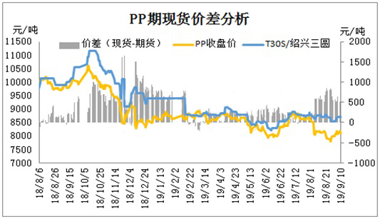 ????????由PP期現(xiàn)貨價(jià)差對(duì)比發(fā)現(xiàn),期現(xiàn)貨價(jià)差在七八月份價(jià)差明顯擴(kuò)大化,進(jìn)入九月份期貨受資金面及供需面支撐,期貨連漲助推期現(xiàn)貨價(jià)差逐步收窄。商家受長(zhǎng)期利潤(rùn)虧損影響,面對(duì)期貨連漲局勢(shì),炒作心態(tài)油然而生。目前因國(guó)內(nèi)PP產(chǎn)能集中檢修,市場(chǎng)供應(yīng)面利好支撐市場(chǎng)報(bào)盤。期現(xiàn)貨價(jià)差受供需影響有進(jìn)一步收窄趨勢(shì)。