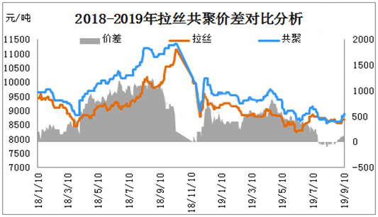 ????????2018-2019年P(guān)P拉絲、共聚在7-8月處于僵持低迷狀態(tài),業(yè)者對(duì)長(zhǎng)期成交疲態(tài)市場(chǎng)看空情緒明顯加重。商家因擔(dān)憂后市,低價(jià)甩貨明顯增多。9月市場(chǎng)受兩油庫(kù)存快速消耗及期貨連漲支撐,市場(chǎng)呈現(xiàn)絕地反彈局勢(shì),拉絲與共聚價(jià)差逐步拉開距離。目前拉絲與共聚價(jià)差已經(jīng)由原來持平狀態(tài),擴(kuò)大至100-200元/噸。根據(jù)目前拉絲與共聚成本價(jià)差計(jì)算,共聚高于拉絲300-400元/噸屬于正常價(jià)差,拉絲與共聚有價(jià)差有進(jìn)一步擴(kuò)大趨勢(shì)。