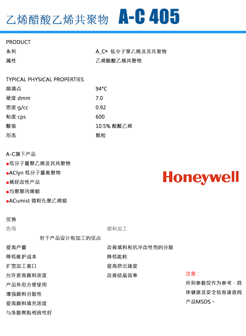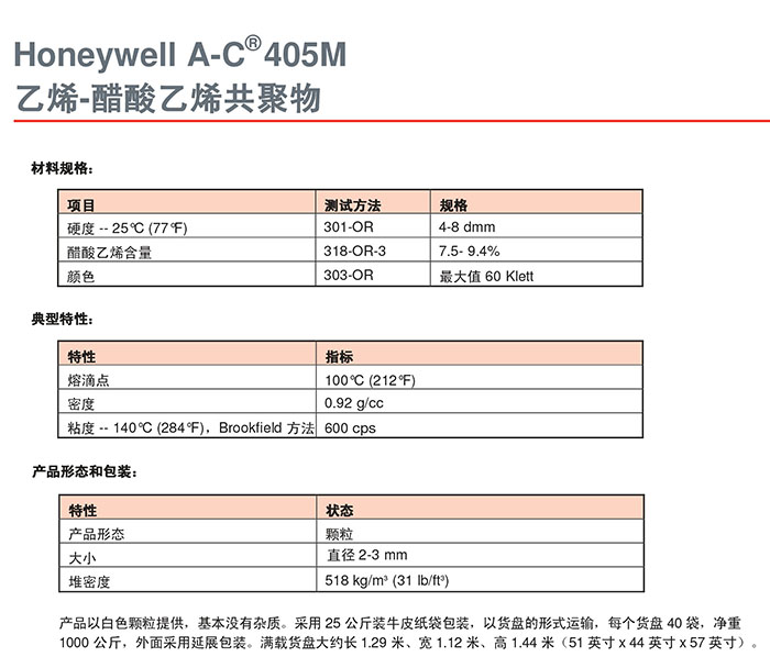 - Honeywell霍尼韋爾 A-C 405M/AC 405M 蠟粉 乙烯-醋酸乙烯共聚物 (EVA) 物性表, Honeywell霍尼韋爾 A-C 405M/AC 405M 蠟粉 乙烯-醋酸乙烯共聚物 (EVA) 產品參數,Honeywell霍尼韋爾 A-C 405M/AC 405M 蠟粉 乙烯-醋酸乙烯共聚物 (EVA) 性能表,Honeywell霍尼韋爾 A-C 405M/AC 405M 蠟粉 乙烯-醋酸乙烯共聚物 (EVA) 出廠報告, MSDS,, 物質安全資料表, UL黃卡,{ SGS報告, RoHS, 食品級認證, NSF飲用水標準, 產品資料, 產品性能, 出廠報告, 原廠原包, 代理商, 熱變形溫度, 熔指數, 流動系數, 抗沖擊性能、沖擊強度, 低溫韌性、低溫抗沖擊性能, 熔體流動系數、熔體流動速率, 加工工藝、加工參數、加工溫度, 歐盟RoHS 德國FDA 美國FDA 日本FDA