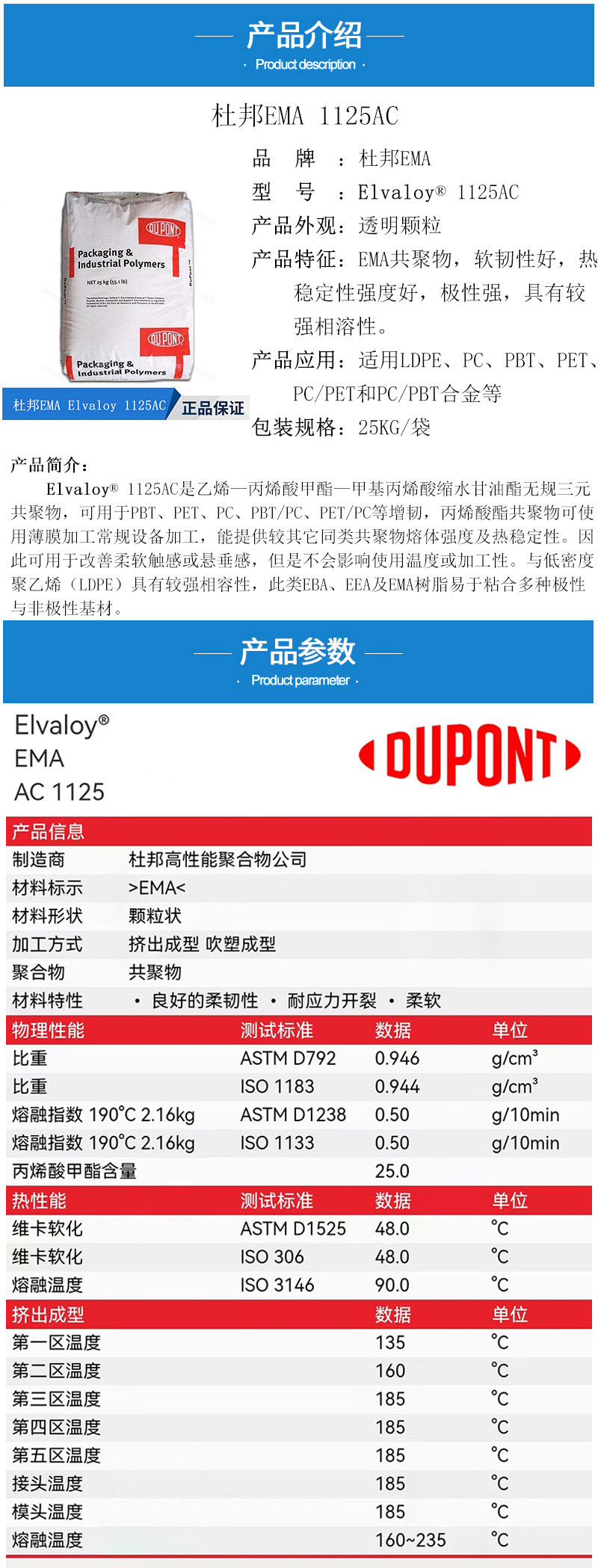 - EMA 杜邦 1125 相溶劑 PC/PET PBT增韌劑 LDPE薄膜 Elvaloy 物性表, EMA 杜邦 1125 相溶劑 PC/PET PBT增韌劑 LDPE薄膜 Elvaloy 產品參數,EMA 杜邦 1125 相溶劑 PC/PET PBT增韌劑 LDPE薄膜 Elvaloy 性能表,EMA 杜邦 1125 相溶劑 PC/PET PBT增韌劑 LDPE薄膜 Elvaloy 出廠報告, MSDS,, 物質安全資料表, UL黃卡,{ SGS報告, RoHS, 食品級認證, NSF飲用水標準, 產品資料, 產品性能, 出廠報告, 原廠原包, 代理商, 熱變形溫度, 熔指數, 流動系數, 抗沖擊性能、沖擊強度, 低溫韌性、低溫抗沖擊性能, 熔體流動系數、熔體流動速率, 加工工藝、加工參數、加工溫度, 歐盟RoHS 德國FDA 美國FDA 日本FDA
