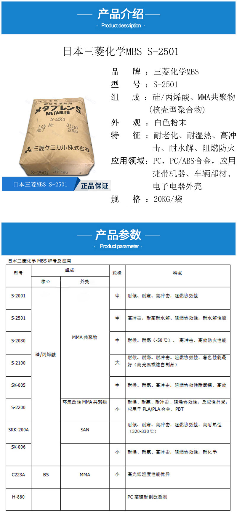 - 三菱麗陽增韌劑S2501 耐高溫耐水解 阻燃效應 高沖擊 日本S-2501 物性表, 三菱麗陽增韌劑S2501 耐高溫耐水解 阻燃效應 高沖擊 日本S-2501 產品參數,三菱麗陽增韌劑S2501 耐高溫耐水解 阻燃效應 高沖擊 日本S-2501 性能表,三菱麗陽增韌劑S2501 耐高溫耐水解 阻燃效應 高沖擊 日本S-2501 出廠報告, MSDS,, 物質安全資料表, UL黃卡,{ SGS報告, RoHS, 食品級認證, NSF飲用水標準, 產品資料, 產品性能, 出廠報告, 原廠原包, 代理商, 熱變形溫度, 熔指數, 流動系數, 抗沖擊性能、沖擊強度, 低溫韌性、低溫抗沖擊性能, 熔體流動系數、熔體流動速率, 加工工藝、加工參數、加工溫度, 歐盟RoHS 德國FDA 美國FDA 日本FDA