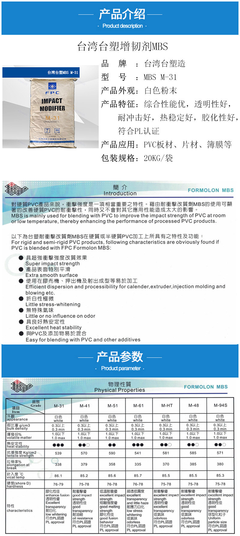 - 臺塑MBS M31綜合性能好 透明耐白化 PVC簿膜 板材片材 增韌劑M-31 物性表, 臺塑MBS M31綜合性能好 透明耐白化 PVC簿膜 板材片材 增韌劑M-31 產品參數,臺塑MBS M31綜合性能好 透明耐白化 PVC簿膜 板材片材 增韌劑M-31 性能表,臺塑MBS M31綜合性能好 透明耐白化 PVC簿膜 板材片材 增韌劑M-31 出廠報告, MSDS,, 物質安全資料表, UL黃卡,{ SGS報告, RoHS, 食品級認證, NSF飲用水標準, 產品資料, 產品性能, 出廠報告, 原廠原包, 代理商, 熱變形溫度, 熔指數, 流動系數, 抗沖擊性能、沖擊強度, 低溫韌性、低溫抗沖擊性能, 熔體流動系數、熔體流動速率, 加工工藝、加工參數、加工溫度, 歐盟RoHS 德國FDA 美國FDA 日本FDA
