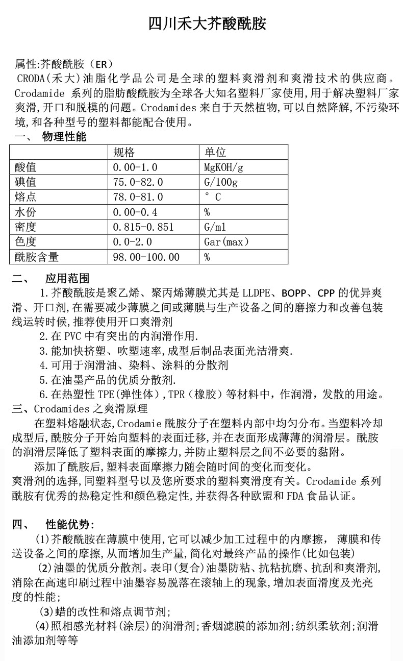 Crodamide ER是英國禾大生產(chǎn)的一款環(huán)保的芥酸酰胺蠟,有粉末和顆粒兩種形式,引起功效的廣泛性,因而具有廣泛的應(yīng)用領(lǐng)域。禾大芥酸酰胺蠟和大部分的基材相容,如LDPE、LLDPE 、HDPE、PP、EVA、PVC、PS、尼龍6、橡膠等,能在物質(zhì)界面形成單分子膜,具有抗粘結(jié)、爽滑、增滑、流平、防水、防濕、防沉淀、抗污損、抗靜電及分散等功效,添加量少而功效大。