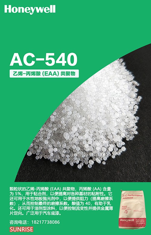 霍尼韋爾A-C 540A為粉末狀的乙烯-丙烯酸 (EAA) 共聚物,丙烯酸 (AA) 含量為 5%,用于粘合劑,以便提高對各種基材的粘附性。霍尼韋爾PE蠟A-C 540A還可用于水性地板拋光劑中,以便提供阻力(提高磨擦系數)。霍尼韋爾PE蠟A-C 540A酸值為40,有助于乳化。還可用于溶劑型涂料,以便控制流變性并提供金屬薄片定向。廣泛用于汽車底漆。霍尼韋爾PE蠟A-C 540A還可用于色母粒和工程樹脂的分散劑。