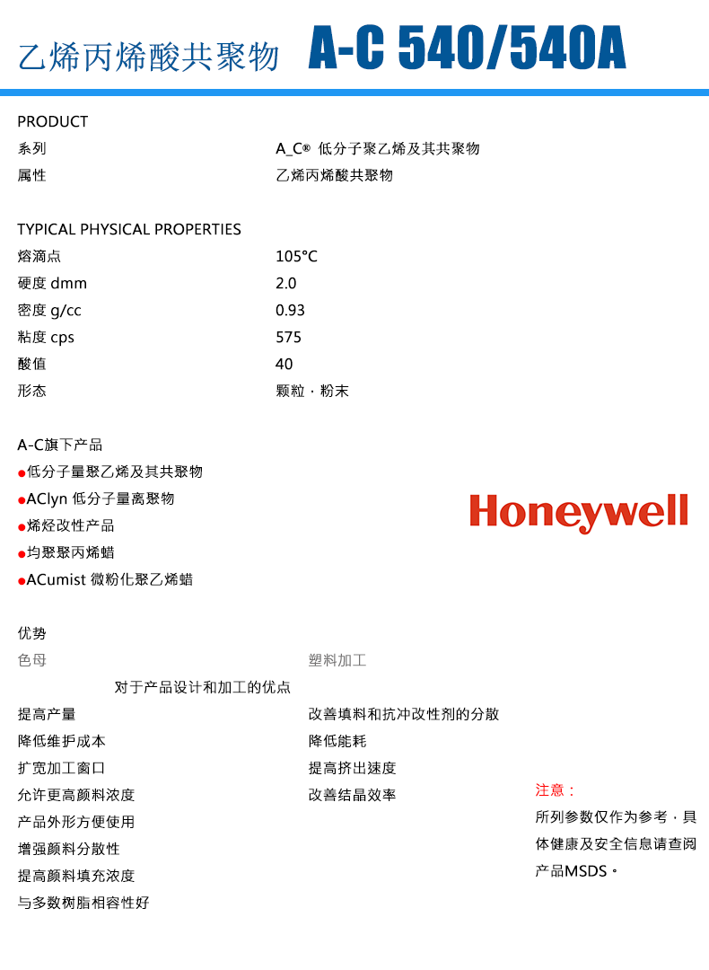 - Honeywell霍尼韋爾 A C 540 蠟粉蠟乳液 物性表, Honeywell霍尼韋爾 A C 540 蠟粉蠟乳液 產品參數,Honeywell霍尼韋爾 A C 540 蠟粉蠟乳液 性能表,Honeywell霍尼韋爾 A C 540 蠟粉蠟乳液 出廠報告, MSDS,, 物質安全資料表, UL黃卡,{ SGS報告, RoHS, 食品級認證, NSF飲用水標準, 產品資料, 產品性能, 出廠報告, 原廠原包, 代理商, 熱變形溫度, 熔指數, 流動系數, 抗沖擊性能、沖擊強度, 低溫韌性、低溫抗沖擊性能, 熔體流動系數、熔體流動速率, 加工工藝、加工參數、加工溫度, 歐盟RoHS 德國FDA 美國FDA 日本FDA