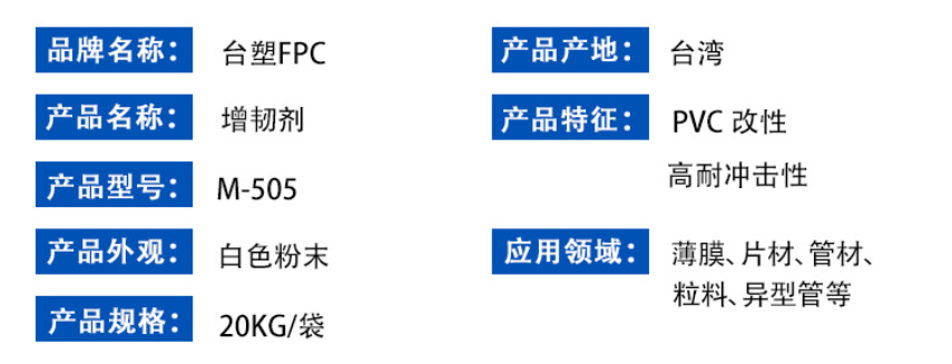 臺塑M-505增韌耐沖擊改質劑,是用于硬質和半硬質PVC制品,如果PVC與M-505混合,具有以下特性: