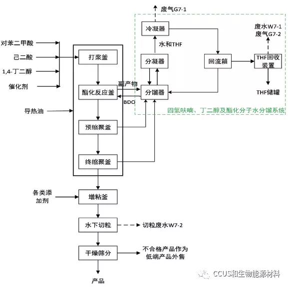 合成PBAT 采用的方法為直接酯化法,主要是以苯二甲酸(PTA)、己二酸(AA)與丁二醇(BDO)為原料,在催化劑的作用下直接進行酯化、縮聚反應(yīng)而制得。該方法優(yōu)點是工藝流程短、原料利用率高、反應(yīng)時間短、生產(chǎn)效率高;缺點是反應(yīng)體系物質(zhì)較復(fù)雜、相對分子質(zhì)量分布寬、反應(yīng)介質(zhì)酸性較強。PBAT 生產(chǎn)過程中,酯化及縮聚轉(zhuǎn)化率約為99%。反應(yīng)過程中,有副反應(yīng)發(fā)生:過剩的1,4-丁二醇脫水生成四氫呋喃。
