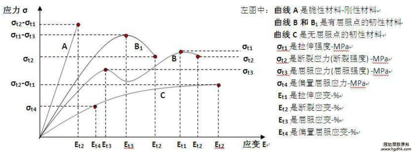 曲線 B1 是常見的曲線,屈服強度等于拉伸強度。我們給客戶測試時常出現(xiàn)如此曲線。高韌性的材料其拉伸強度高于屈服應力,曲線 B 就是拉伸強度高于屈服應 力,我們在給供應商測試加了沖擊改性劑的 PS 材料時,就出現(xiàn)了曲線 B 的現(xiàn)象。該材料比 PS 的沖擊強度提高許多,是高韌性材料了。 在 GB/T9341-2000 塑料彎曲試驗方法中:只有具有線性應力-應變特性的材料。其彎曲性能才能作為工程設計的依據(jù),而非線性材料的彎曲性能僅是公稱值。 對于脆性材料,即難于作拉伸試驗的材料,最好采用彎曲試驗。