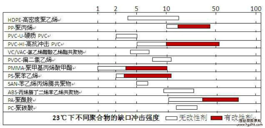從上圖可見 PA 的抗沖擊性能最好;其次是 PC。PP、PVC-HI、PMMA、PS、PA 添加沖擊改性劑后,抗沖擊性能大大提高。ABS、PA、PC 即使不加抗充擊改性劑 的抗沖擊性能也較大。其中 PMMA 和 PC 都是透明材料,PMMA 的剛性好,脆;PC 的韌性好,不脆。無改性劑的 PS 抗沖擊性能較差,我們曾經(jīng)為客戶測試過加入改 性劑的 PS 產(chǎn)品,抗沖擊性能提高許多。 沖擊改性劑的品種很多,常用的有 ACR-丙烯酸酯類樹脂、MBS-甲基丙烯酸甲酯-丁二烯-苯乙烯共聚物、CPE-氯化聚乙烯、ABS、EVA、EPT-三元乙丙膠等。 從制品的改性效果來看,ACR 是綜合性能最好的一類,MBS 是透明制品重要的沖擊改性劑,在全球沖擊改性劑市場中占有重要地位。