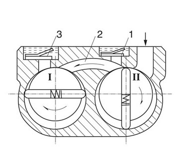 雙級旋片式真空泵由兩個工作室組成,兩室前后串聯,同向等速旋轉,Ⅰ室是低真空級,Ⅱ室是高真空級,被抽氣體由進氣口進入Ⅱ室,當進入的氣體壓力較高時,氣體經Ⅱ室壓縮,壓強急速增大,被壓縮的氣體不僅從高級排氣閥排出,而且經過中壁通道,進入Ⅰ室,在Ⅱ室被壓縮,從低級排氣閥排出;當進入Ⅰ室的氣體壓力較小時,雖經Ⅱ室的壓縮,也推不開高級排氣閥排出,氣體全部經中壁通道進講入Ⅰ室,經Ⅰ室的繼續壓縮,由低級排氣閥排出,因此雙級旋片式真空泵比單級旋片式真空泵的限真空高。