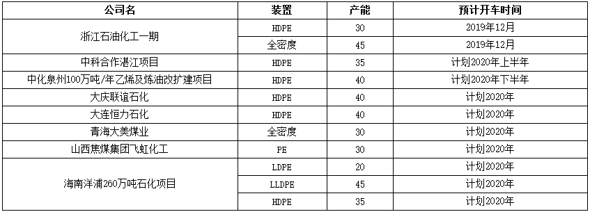 ????????2019年年內(nèi)中安聯(lián)合35萬噸LLDPE裝置已經(jīng)于7月30日開車生產(chǎn),寧夏寶豐二期30萬噸HDPE裝置已經(jīng)于9月27日投料生產(chǎn),算上初步計劃四季度投產(chǎn)的浙江石化來說,截止2020那邊預(yù)期投產(chǎn)裝置初步預(yù)計為390萬噸。