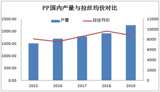 ????????國內PP產量與拉絲均價呈現較為明顯反比趨勢,2016、及2018-2019年表現尤為明顯。2016年國內PP產量經歷了2014-2015年繼續擴張后,年產量高達1695.69萬噸,當年國內拉絲均價由2015年8090元/噸降至7570元/噸,降幅6.43%。2018年是近幾年產能增速相對較慢的一年,受整體擴能放緩且國內大型企業檢修集中支撐,國內拉絲均聚同比2017年漲幅12.7%。2019年1-10月份整體擴能202萬噸,均價同比2018年跌幅8.35%。