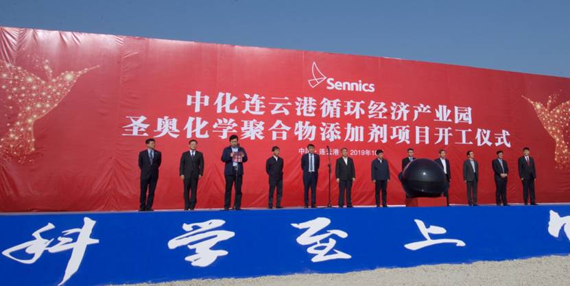 ????????10月20日上午,圣奧化學聚合物添加劑項目開工儀式在中化連云港循環經濟產業園舉行,中化集團化工事業部總裁、中化國際總經理、圣奧化學董事長劉紅生,中化國際副總經理、圣奧化學CEO蘇賦,連云港市委書記項雪龍、市長方偉共同點亮象征項目啟動的水晶球,這標志著圣奧化學戰略發展向前邁出關鍵性一步。