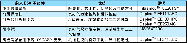 ????????在采用北歐化工和博祿產(chǎn)品生產(chǎn)的各項(xiàng)蔚來ES8內(nèi)外飾零部件中,設(shè)計新穎、功能強(qiáng)大的中央通道骨架是另一大亮點(diǎn)——該零部件適合司機(jī)或乘客存儲名貴手提包。北歐化工和博祿的Fibremod? CB201SY為碳纖維填充聚丙烯改性材料,是Fibremod?系列中的一款超輕量化產(chǎn)品。采用這款材料生產(chǎn)的中央通道骨架有利于為客戶提供更高的價值:零部件減重20%(與采用傳統(tǒng)產(chǎn)品40%長玻纖增強(qiáng)聚丙烯相比)、具有更好的尺寸穩(wěn)定性、高剛性,且適用于注塑成型工藝。