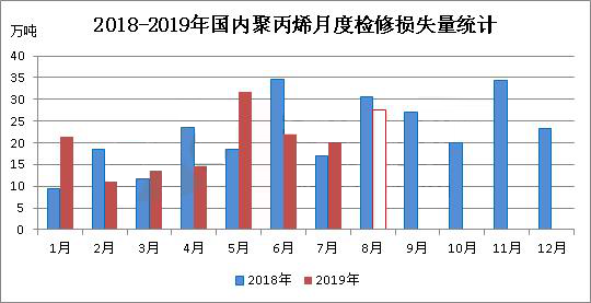 ????????2019年8月份,國(guó)內(nèi)聚丙烯檢修損失量預(yù)計(jì)在27.63萬(wàn)噸,環(huán)比(2019年7月份20.12萬(wàn)噸)增加7.51萬(wàn)噸,增幅在37.33%;同比(2018年8月30.66萬(wàn)噸)減少3.03萬(wàn)噸,減少9.9%。2019年1-8月份,預(yù)計(jì)累積檢修損失量為162.15萬(wàn)噸,較去年同期(2018年1-8月164.11萬(wàn)噸)略有減少,降幅1.2%。