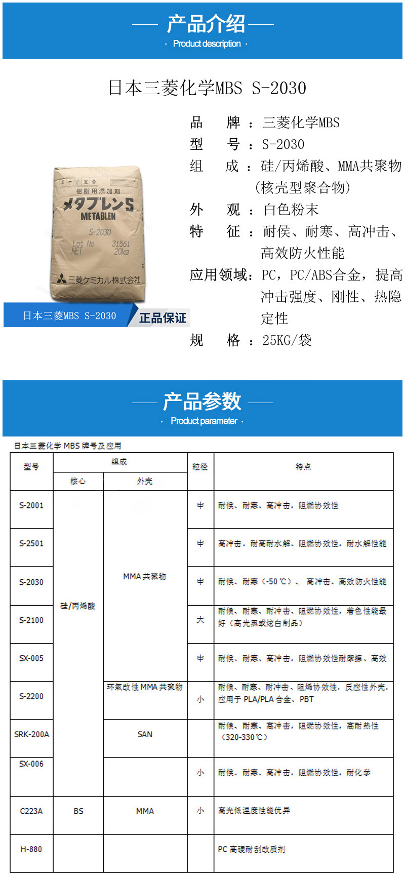 - 三菱增韌劑S2030 耐候耐寒(-50℃)增韌 高效防火 麗陽MBS S-2030 物性表, 三菱增韌劑S2030 耐候耐寒(-50℃)增韌 高效防火 麗陽MBS S-2030 產品參數,三菱增韌劑S2030 耐候耐寒(-50℃)增韌 高效防火 麗陽MBS S-2030 性能表,三菱增韌劑S2030 耐候耐寒(-50℃)增韌 高效防火 麗陽MBS S-2030 出廠報告, MSDS,, 物質安全資料表, UL黃卡,{ SGS報告, RoHS, 食品級認證, NSF飲用水標準, 產品資料, 產品性能, 出廠報告, 原廠原包, 代理商, 熱變形溫度, 熔指數, 流動系數, 抗沖擊性能、沖擊強度, 低溫韌性、低溫抗沖擊性能, 熔體流動系數、熔體流動速率, 加工工藝、加工參數、加工溫度, 歐盟RoHS 德國FDA 美國FDA 日本FDA