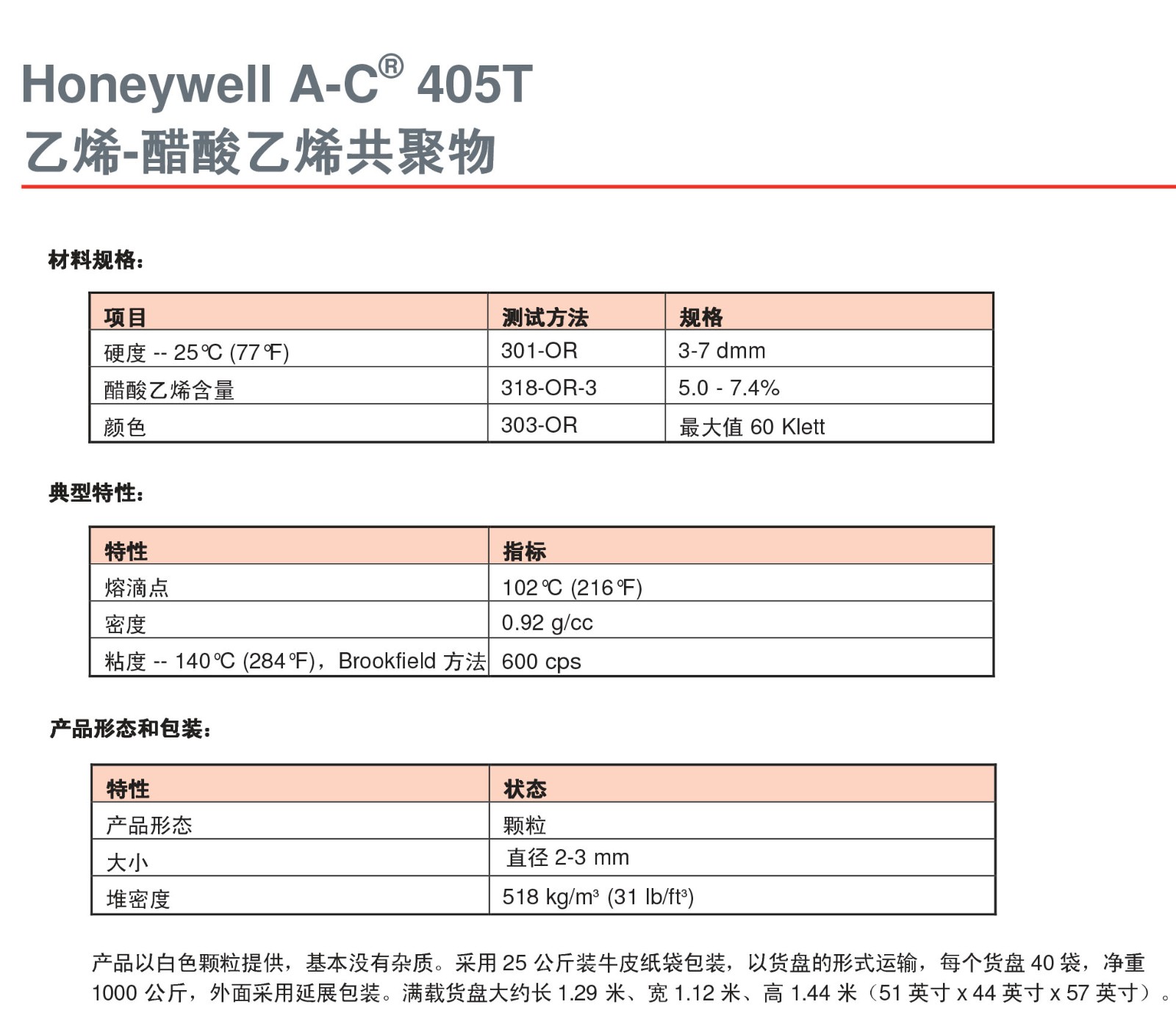 - 霍尼韋爾 HONEYWELL 聚乙烯蠟 A-C 405T 物性表, 霍尼韋爾 HONEYWELL 聚乙烯蠟 A-C 405T 產品參數,霍尼韋爾 HONEYWELL 聚乙烯蠟 A-C 405T 性能表,霍尼韋爾 HONEYWELL 聚乙烯蠟 A-C 405T 出廠報告, MSDS,, 物質安全資料表, UL黃卡,{ SGS報告, RoHS, 食品級認證, NSF飲用水標準, 產品資料, 產品性能, 出廠報告, 原廠原包, 代理商, 熱變形溫度, 熔指數, 流動系數, 抗沖擊性能、沖擊強度, 低溫韌性、低溫抗沖擊性能, 熔體流動系數、熔體流動速率, 加工工藝、加工參數、加工溫度, 歐盟RoHS 德國FDA 美國FDA 日本FDA