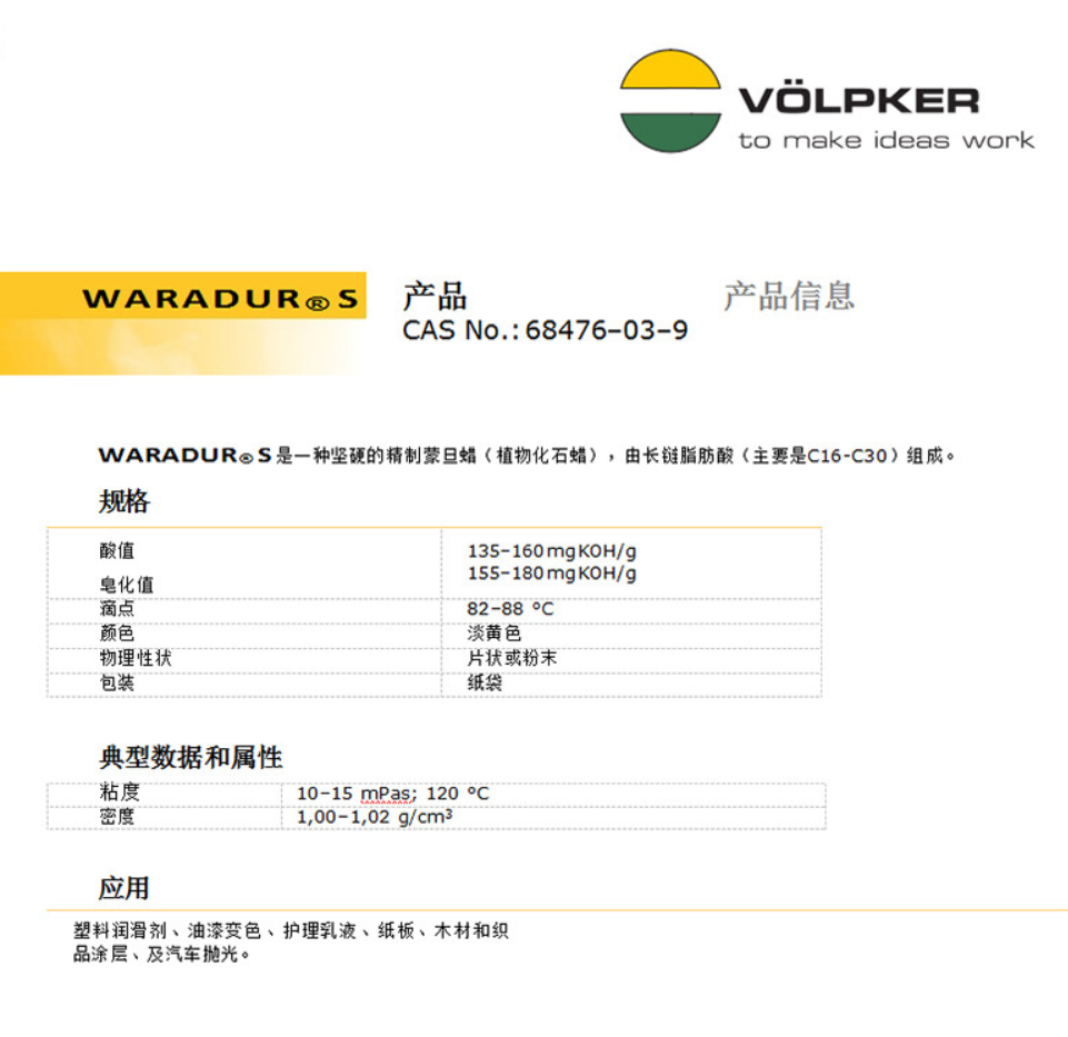 - 德國沃卡VOELPKER WARADUR S蠟 皂化蒙旦蠟 片狀工程塑料 物性表, 德國沃卡VOELPKER WARADUR S蠟 皂化蒙旦蠟 片狀工程塑料 產品參數,德國沃卡VOELPKER WARADUR S蠟 皂化蒙旦蠟 片狀工程塑料 性能表,德國沃卡VOELPKER WARADUR S蠟 皂化蒙旦蠟 片狀工程塑料 出廠報告, MSDS,, 物質安全資料表, UL黃卡,{ SGS報告, RoHS, 食品級認證, NSF飲用水標準, 產品資料, 產品性能, 出廠報告, 原廠原包, 代理商, 熱變形溫度, 熔指數, 流動系數, 抗沖擊性能、沖擊強度, 低溫韌性、低溫抗沖擊性能, 熔體流動系數、熔體流動速率, 加工工藝、加工參數、加工溫度, 歐盟RoHS 德國FDA 美國FDA 日本FDA