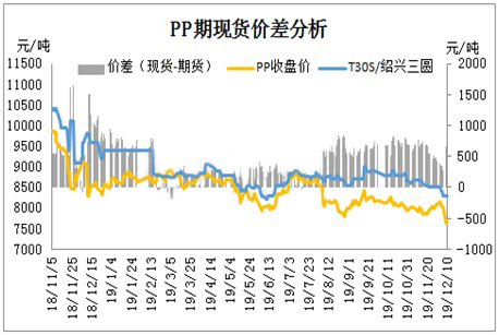 2019年12月庫存顯示整體呈現(xiàn)震蕩下滑趨勢(shì),整體庫存維持在60-70萬噸/年,但全球經(jīng)濟(jì)偏弱運(yùn)行及國內(nèi)實(shí)體企業(yè)訂單力度不及預(yù)期,市場(chǎng)原料消耗力度受到制約。同時(shí)2019年P(guān)P新一輪擴(kuò)能高峰期再次來臨,浙江石化及大連恒力等大型聚烯烴裝置落地試運(yùn)行,市場(chǎng)供需壓力更加凸顯,加快現(xiàn)貨市場(chǎng)拉絲下挫壓力。