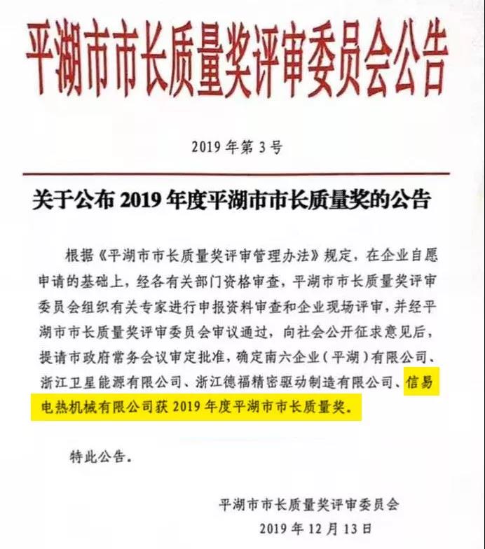 平湖市市長質量獎是平湖市人民政府設立的最高質量獎項,由平湖市政府表彰和獎勵,每年度評審一次,每屆不超過5個。該獎項旨在發揮市長質量獎的導向作用,推動企業實施卓越績效模式和先進質量管理方法,深入開展質量管理創新、質量強企創建活動,樹立質量標桿,加強典型示范,加快推進質量強市建設,促進經濟轉型升級。平湖信易2019年度獲此殊榮,深感榮幸,同時亦感到責任之深重,今后信易將繼續在精益管理,保證質量,做好品牌等方面努力進取,追求卓越,為塑膠輔機行業做出更大的貢獻。