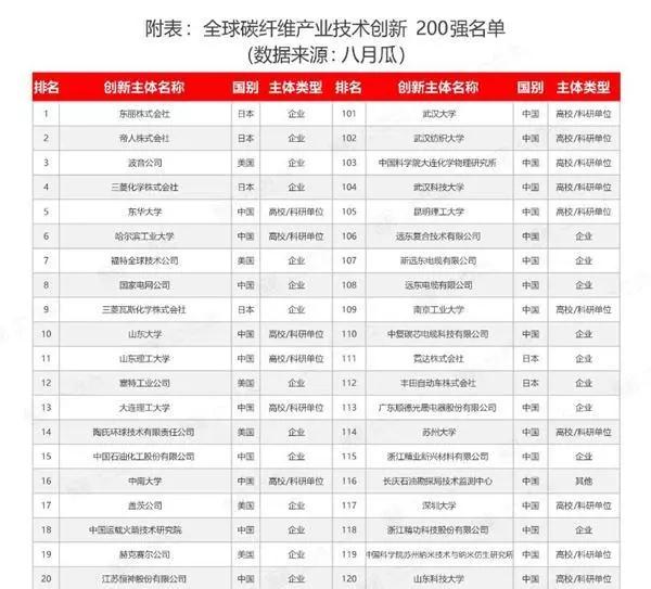 報告根據碳纖維產業技術創新指標體系,以2014-2018年全球專利信息為基礎數據源,結合相關國家或地區經濟發展水平,對近5年全球碳纖維產業領域3萬余家技術創新主體的技術創新水平進行了量化評測,遴選出全球碳纖維產業技術創新200強。